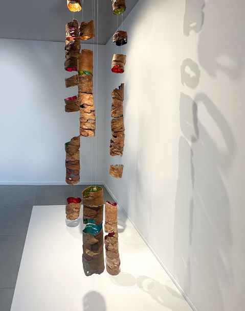 A suspended sculpture formed from hand-shaped salvaged tree bark and reflective material, Shivelight embodies cycles of decay and renewal. The title refers to the old word meaning the shafts of light that filter through trees — a fleeting phenomenon made tangible through bark fragments carrying memory of growth and loss, interlaced with reflective surfaces that catch and transform light. A fragile vertical presence, it gathers and releases illumination, inviting stillness and an awareness of what is often overlooked: the invisible, the possible, the quietly luminous.